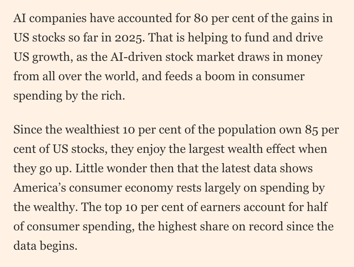 OpenAI has proven that they’re incredibly good at getting attention. ChatGPT recently eclipsed 800 million weekly active users, and that hardware device is still in the works. What if they do primarily use all that attention and the deep personalization that AI enables to sell us stuff? We love being sold stuff, and as long as the stock market doesn’t collapse, we’ll keep buying it, even while pesky things like wealth inequality continue to grow. From the FT: