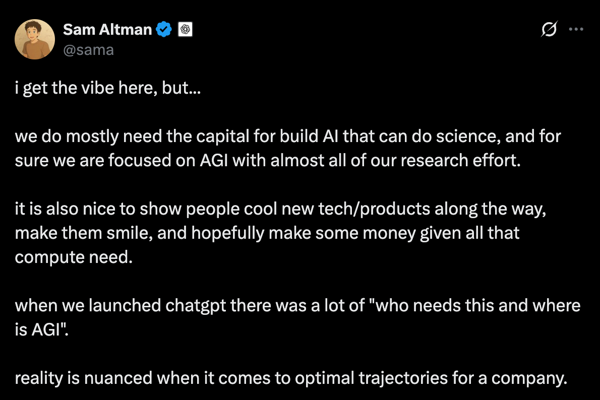 There was one more very visible reaction to OpenAI’s announcement, and it boiled down to “you guys were supposed to be the ones making the omnipotent computer god that will free us from the shackles of manual and intellectual labor and also cure all diseases so why did you give up and make a slop generator?” Sam Altman had an interesting public response to this: